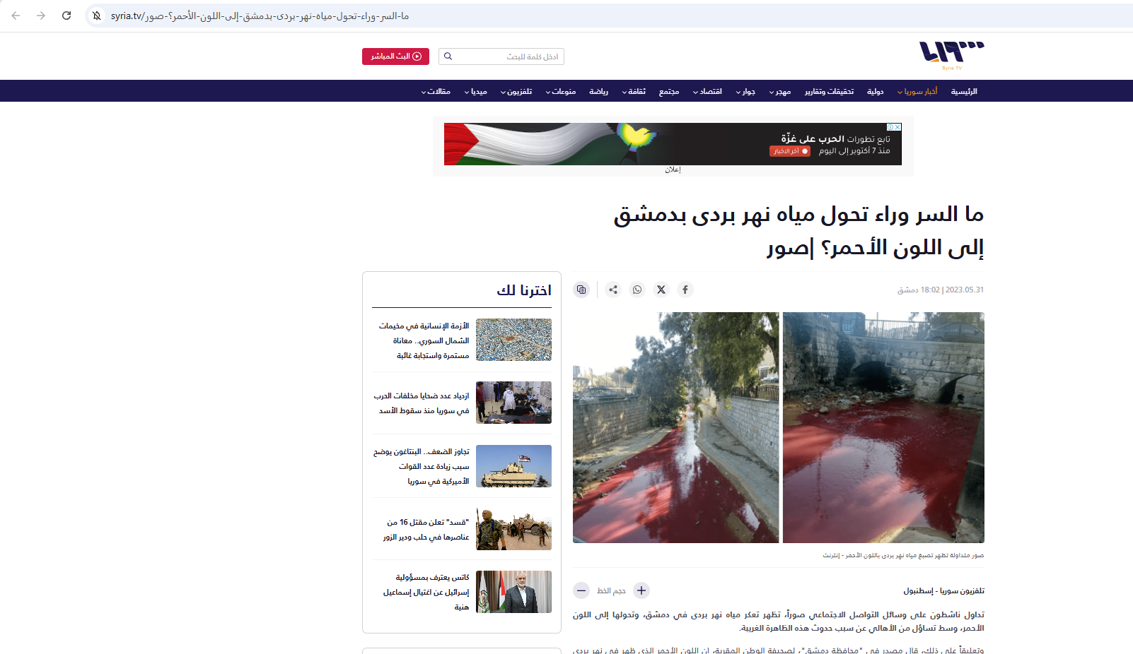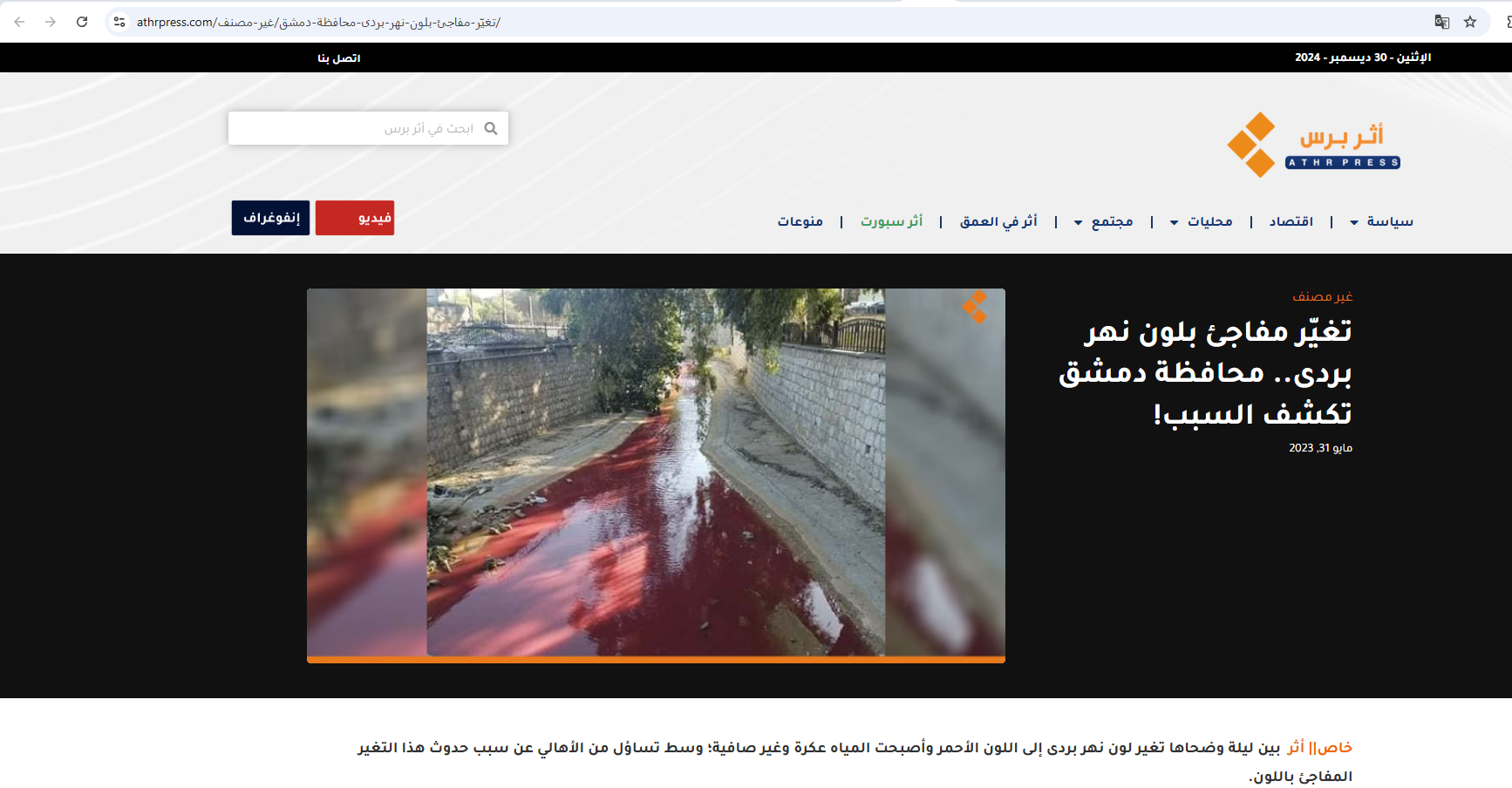 يومذاك، أثار تغيّر لون مياه نهر بردى في دمشق إلى الأحمر، بشكل مفاجئ، استغراب وتساؤلات أهالي المدينة، "اذ بدت مياه النهر معكرة وغير صافية".