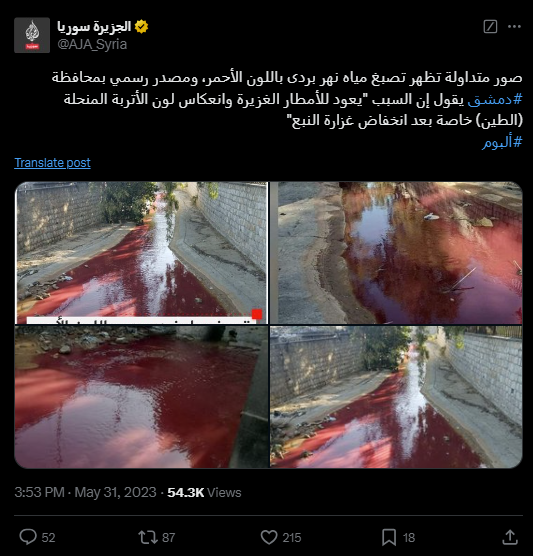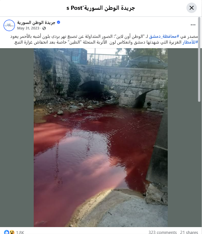 يؤكد ذلك العثور على الصورة منشورة في مواقع اخبارية، في 31 ايار 2023، ضمن تقارير عن "اصطباغ مياه نهر بردى في دمشق باللون الاحمر" يومذاك