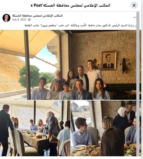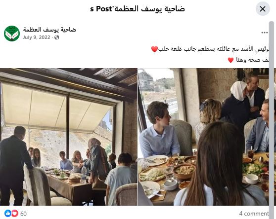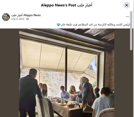 كذلك، نقع على صور ثابتة مماثلة تظهر الاسد وعائلته في المكان ذاته، منشورة في حسابات سورية في 9 تموز 2022، بالشرح ذاته اعلاه. "الرئيس الاسد وعائلته في أحد المطاعم قرب قلعة حلب".
