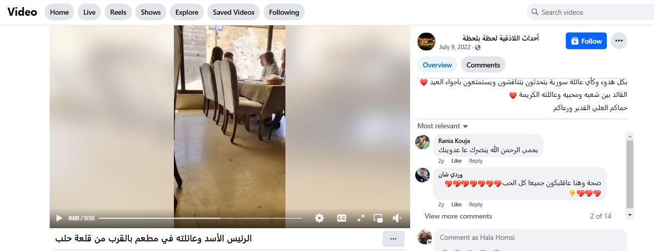 يؤكد ذلك العثور على المقطع، بالبحث بواسطة استخدام كلمات مفاتيح، منشورا في حسابات في 9 تموز 2022، بكونه يظهر الرئيس السوري بشار الاسد برفقة عائلته في مطعم بالقرب من قلعة حلب.