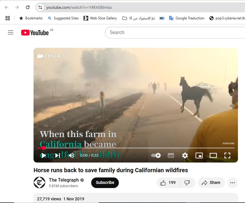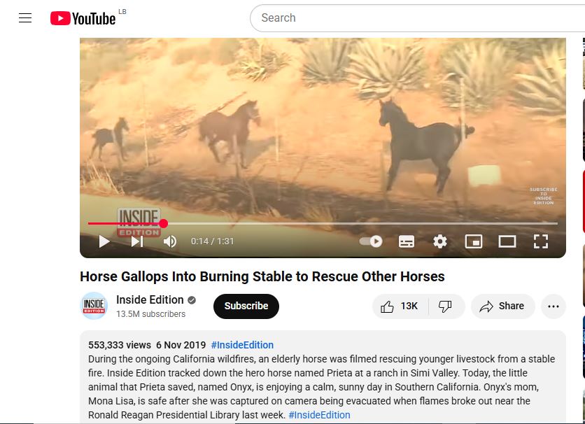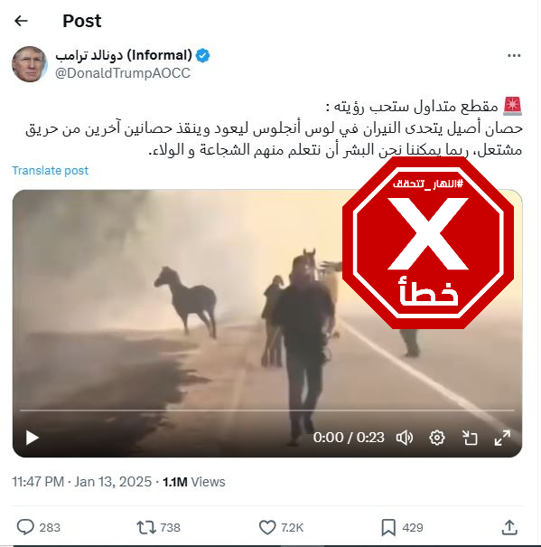 حصد الفيديو خلال اليومين الماضيين اكثر من مليون مشاهدة في أحد الحسابات في أكس. 23 ثانية تشاهدون خلالها حصانا يركض وسط دخان كثيف انتشر في الارجاء، ليتوجه الى اراض حيث صادف حصانين آخرين ويعود معهما. ووفقا لمزاعم أًرفقت بالفيديو، فإن "هذا الحصان الأصيل تحدى النيران في لوس أنجليس ليعود وينقذ حصانين آخرين من حريق مشتعل".