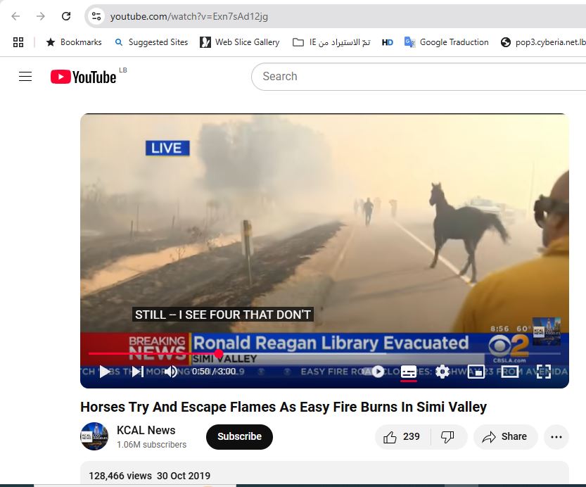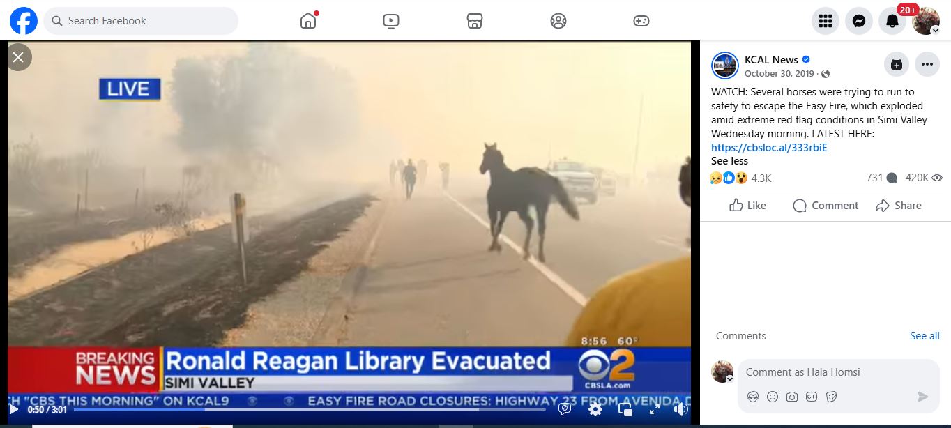 يؤكد ذلك العثور على المقطع، بتجزئته الى مشاهد ثابتة (Invid)، منشورا ضمن فيديو أطول في حسابي KCAL News وCBS News Los Angeles في يوتيوب وفايسبوك، في 30 تشرين الاول 2019، بعنوان: خيول تحاول الهروب من النيران بينما تشتعل حرائق في سيمي فالي Simi Valley.