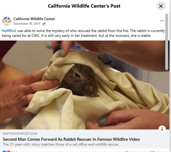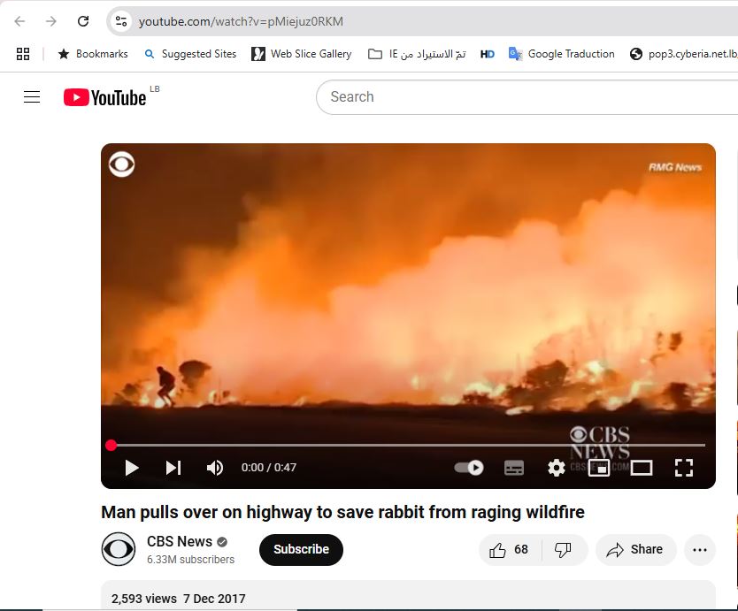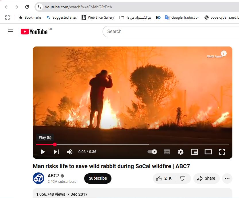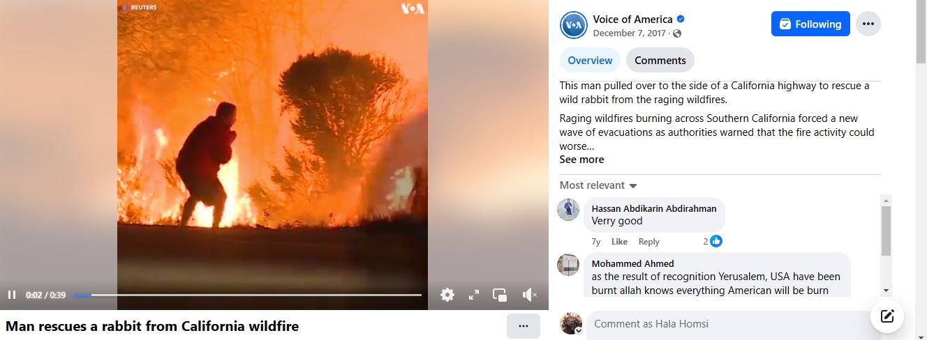 يؤكد ذلك العثور على المقطع، بعد تجزئته الى مشاهد ثابتة (Invid)، منشورا على نطاق واسع في مواقع اخبارية، لا سيما أميركية، وفي حساباتها، في 7 كانون الاول 2017، بعنوان: "رجل يتوقف على طريق سريع لإنقاذ أرنب من حريق غابات مستعر".