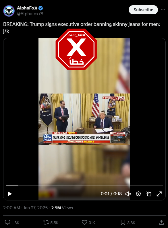 هذا الفيديو زائف وترامب لم يوقع أمراً تنفيذياً يمنع الرجال من ارتداء الجينز الضيق FactCheck#