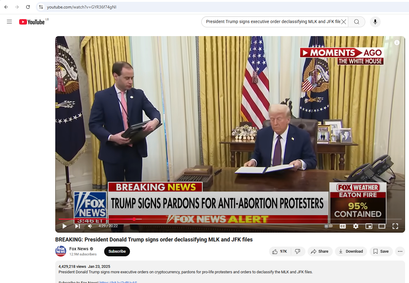 فالبحث عن المقطع المتناقل، بتجزئته الى صور ثابتة (Invid)، يوصلنا عبر خيوط الى المشاهد الاصلية منشورة، بنسخة أطول (20.22 دقيقة)، في موقع قناة "فوكس نيوز" الاميركية وحسابها في يوتيوب، في 23 كانون الثاني 2025، بعنوان: "الرئيس ترامب يوقع أمرا تنفيذيا برفع السرية عن ملفات (اغتيال) مارتن لوثر كينغ وجون كينيدي".