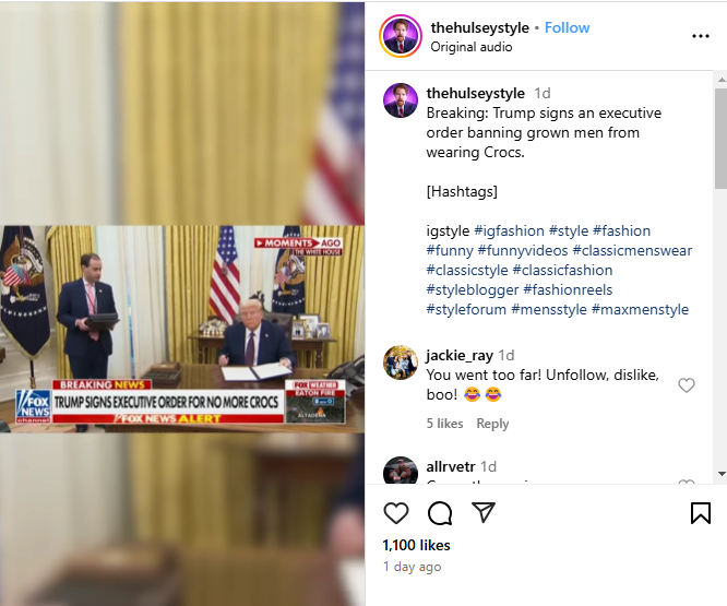 وقد نشر هولسي، في 27 منه، مقطعا معدلا آخر ساخراً استخدم فيه المشاهد الاصلية ذاتها لترامب اعلاه، بمزاعم خاطئة انها تظهر "توقيعه أمرا تنفيذيا يمنع الرجال البالغين من انتعال أحذية كروكس".