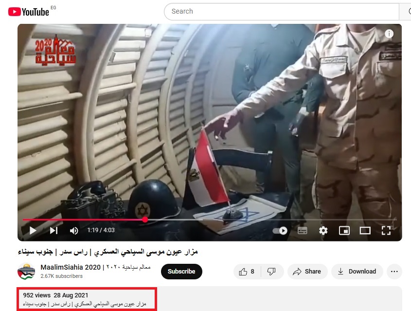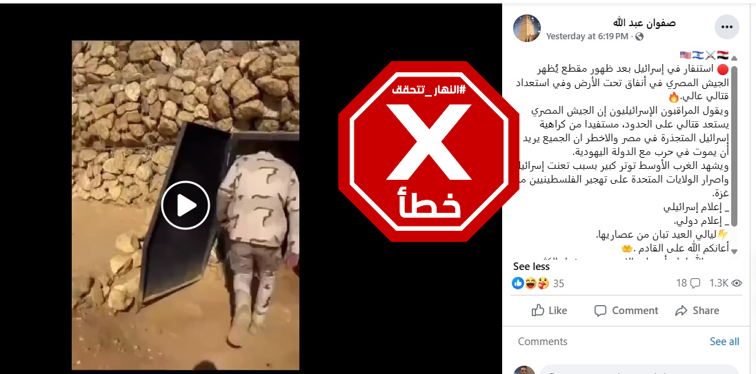 فقد انتشر على منصات التواصل الاجتماعي فيديو يٌظهر دخول فرد بزي الجيش المصري داخل أحد التحصينات في الصحراء. وكتب معه أحد الحسابات على فايسبوك تعليقا (من دون تدخل): "استنفار في إسرائيل بعد ظهور مقطع يُظهر الجيش المصري في أنفاق تحت الأرض، وفي استعداد قتالي عال... ويقول المراقبون الإسرائيليون إن الجيش المصري يستعد للقتال على الحدود...".