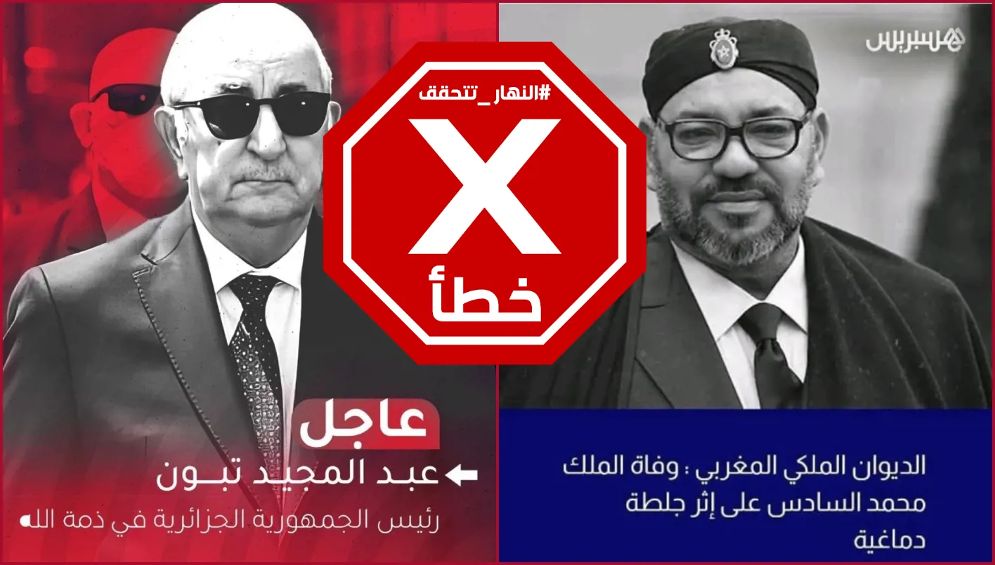 خلال الساعات الماضية، انتشرت على نطاق واسع منشورات تحمل شعار الموقع الاخباري المغربي "هسبريس"، ونقلت، وفقا للمزاعم، عن الديوان الملكي المغربي "وفاة ملك المغرب محمد السادس اثر جلطة دماغية". وفي الوقت ذاته، ادعت منشورات أخرى تحمل شعار قناة "النهار" الجزائرية، وفاة الرئيس الجزائري عبد المجيد تبون.