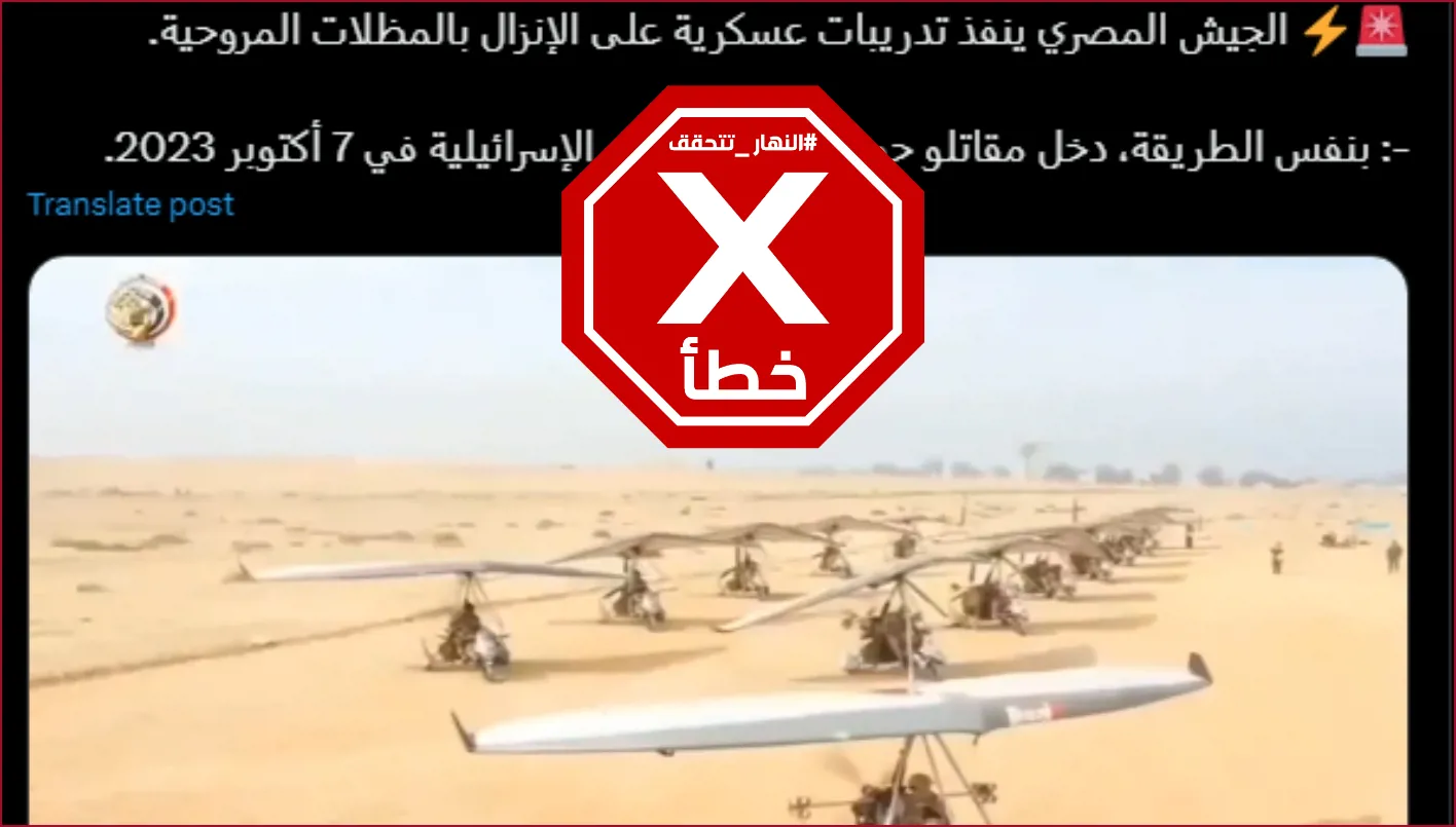 فقد انتشر على موقع إكس فيديو يظهر تحرك مركبات شراعية تخدم في الجيش المصري، ومعروفة باسم "الخفاش الطائر"، بجانب لقطات من عمليات إنزال جوي. وزعم ناشروه أنه لتدريب عسكري نُظّم أخيرا، على غرار هجوم 7 أكتوبر ضد إسرائيل. وكتبوا تعليقا (من دون تدخل): "الجيش المصري ينفذ تدريبات عسكرية على الإنزال بالمظلات المروحية... بالطريقة ذاتها، دخل مقاتلو حماس إلى الأراضي الإسرائيلية في 7 أكتوبر 2023".