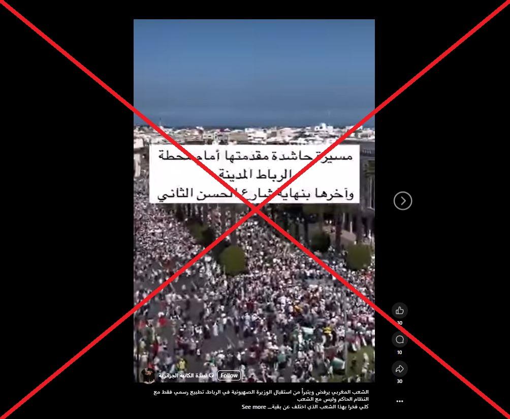 يظهر في الفيديو حشد ضخم من الناس يرفعون العلمين المغربي والفلسطيني في ما يبدو أنها تظاهرة. وجاء في التعليق المرفق: "الشعب المغربي يرفض ويتبرأ من استقبال الوزيرة الإسرائيلية في الرباط، تطبيع رسمي فقط مع النظام الحاكم وليس مع الشعب".