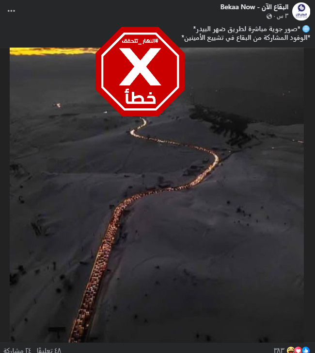 تتداول العديد من الصفحات على مواقع التواصل الاجتماعي صورة تظهر، وفقا للمزاعم، اختناقات مرورية على طريق ضهر البيدر في لبنان، بسبب الوفود التي ستشارك في تشييع الأمينَين السابقين لحزب الله حسن نصرالله وهاشم صفيّ الدين. إلا أن هذا الادعاء خاطئ، إذ أن الصورة قديمة، ومنشورة في شباط 2023، وتعود لازدحام على طريق ضهر البيدر بسبب الجليد. FactCheck#