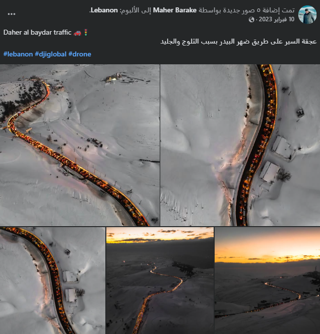 1- الصورة المتداولة قديمة، وقد نشرت في 10 فبراير/شباط 2023، في حساب المصور ماهر بركي، الذي التقطها وعلّق عليها بالقول: "Daher al baydar traffic، عجقة السير على طريق ضهر البيدر بسبب الثلوج والجليد".