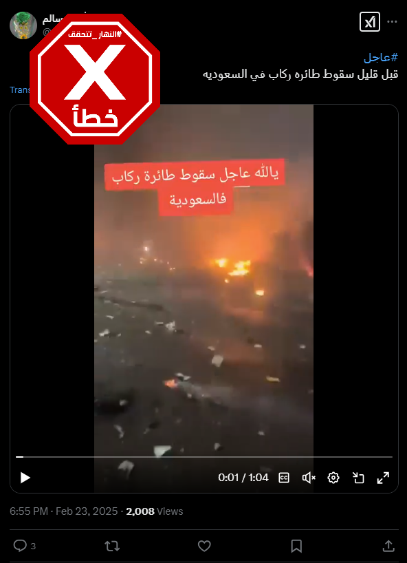 ملاحظة: الى جانب ان هذه المشاهد المتناقلة لها قديمة ولها سياق مختلف، لا توجد أنباء عن تحطم طائرة ركاب في السعودية أخيرا، وفقا لما يبينه البحث.
