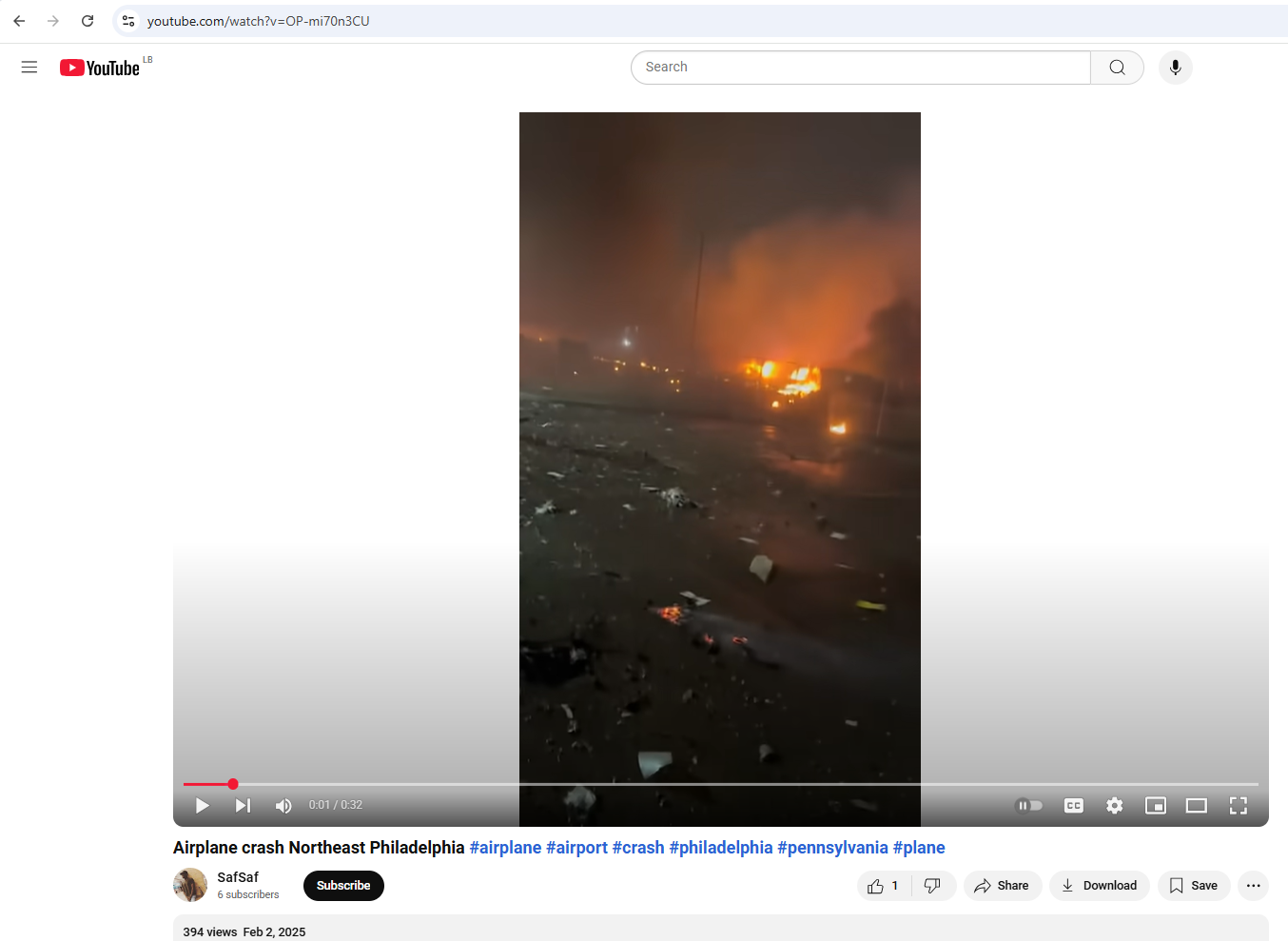 البحث عنه، بتجزئته الى صور ثابتة (Invid)، يوصلنا الى حساب SafSaf في يوتيوب، والذي نشره في 2 شباط 2025، بعنوان: "تحطم طائرة شمال شرق فيلادلفيا".