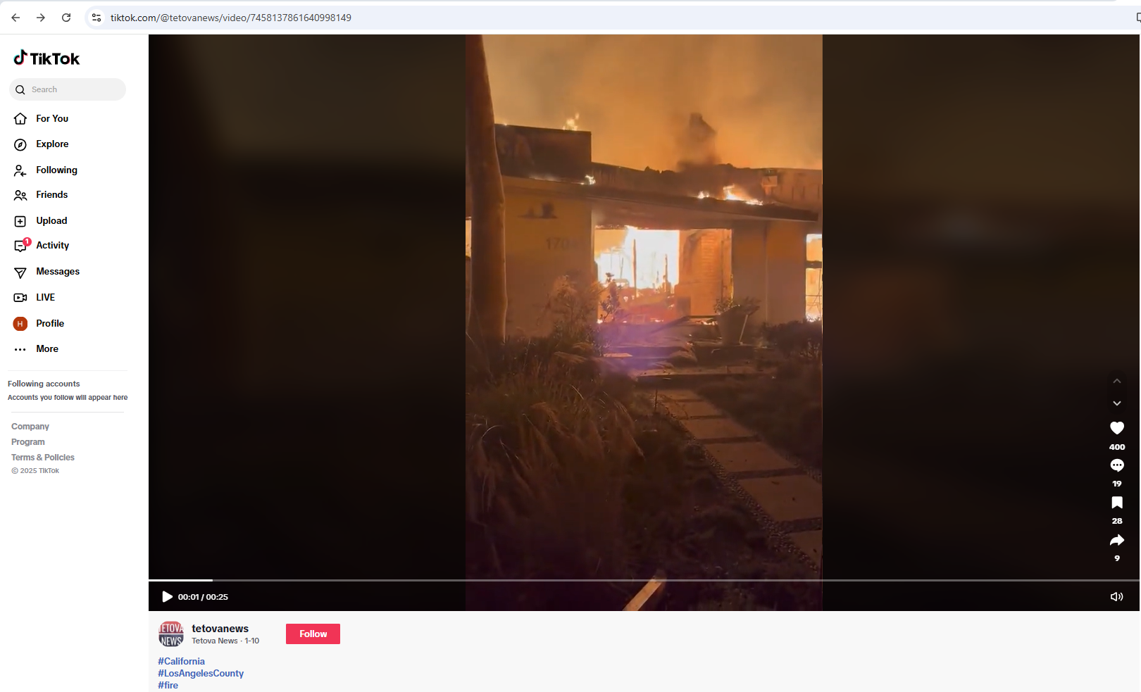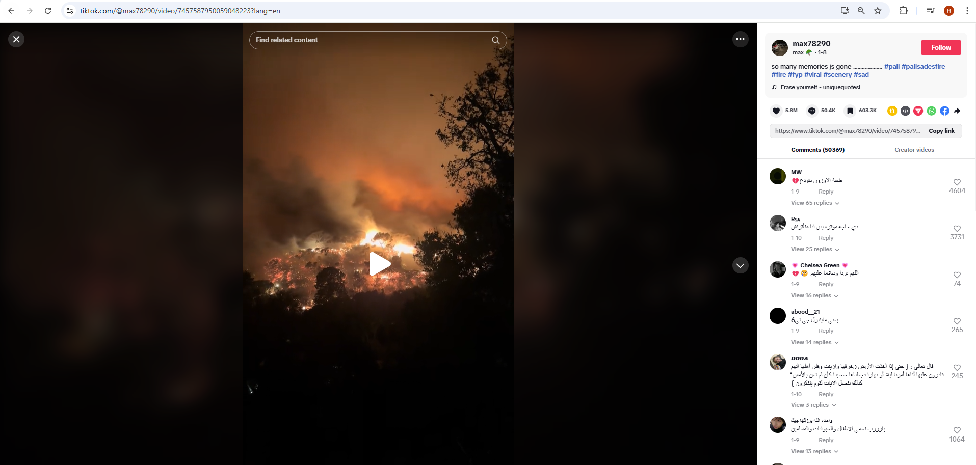 نجده منشورا في 8 كانون الثاني 2025، في حساب max78290@ في تيك توك، في 8 كانون الثاني 2025، بكونه يعود الى حرائق باسيفيك باليساديس.