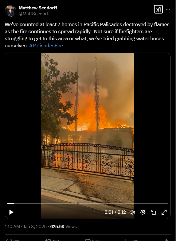 نعثر عليه، بواسطة خيوط، منشورا بنسخة أطول في حساب مراسل قناة FoxLA ماثيو سيدورف في اكس، في 8 كانون الثاني 2025، بكونه يعود الى حرائق باسيفيك باليساديس.