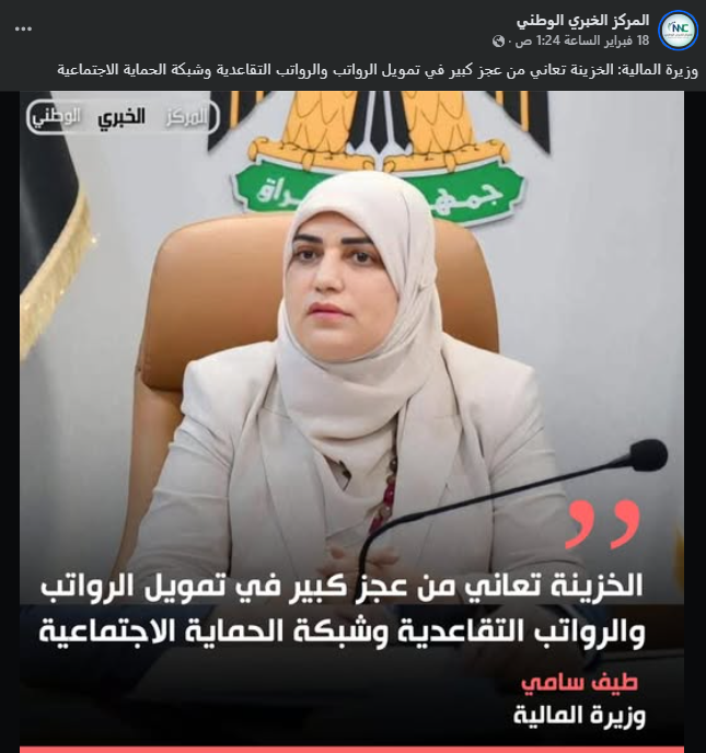 في الادّعاء المتداول، صورة بالقالب الإخباري لوكالة "المركز الخبري الوطني"، تتضمن صورة لوزيرة المالية العراقية طيف سامي، مرفقة بخبر (من دون تدخّل): "وزارة المالية توافق على إطلاق رواتب 20 ألفاً من رفحاء التي كانت متوقفة في زمن الكاظمي".