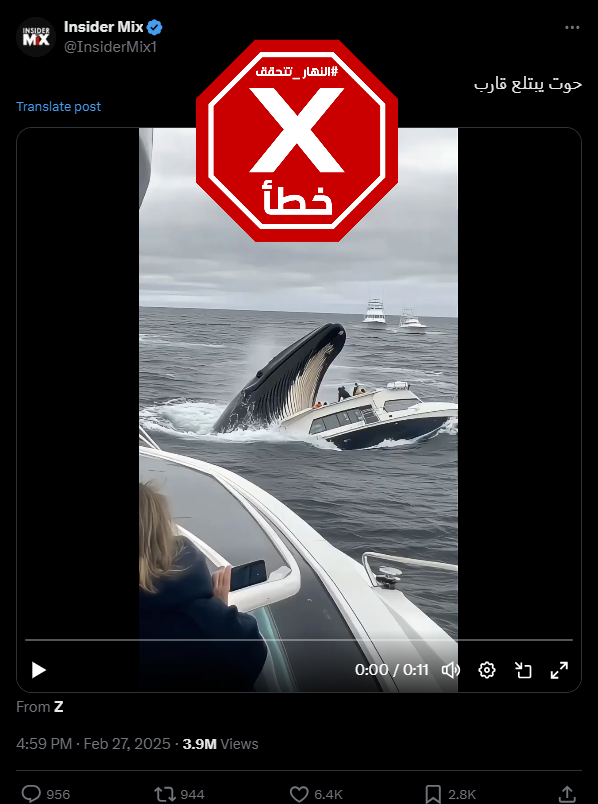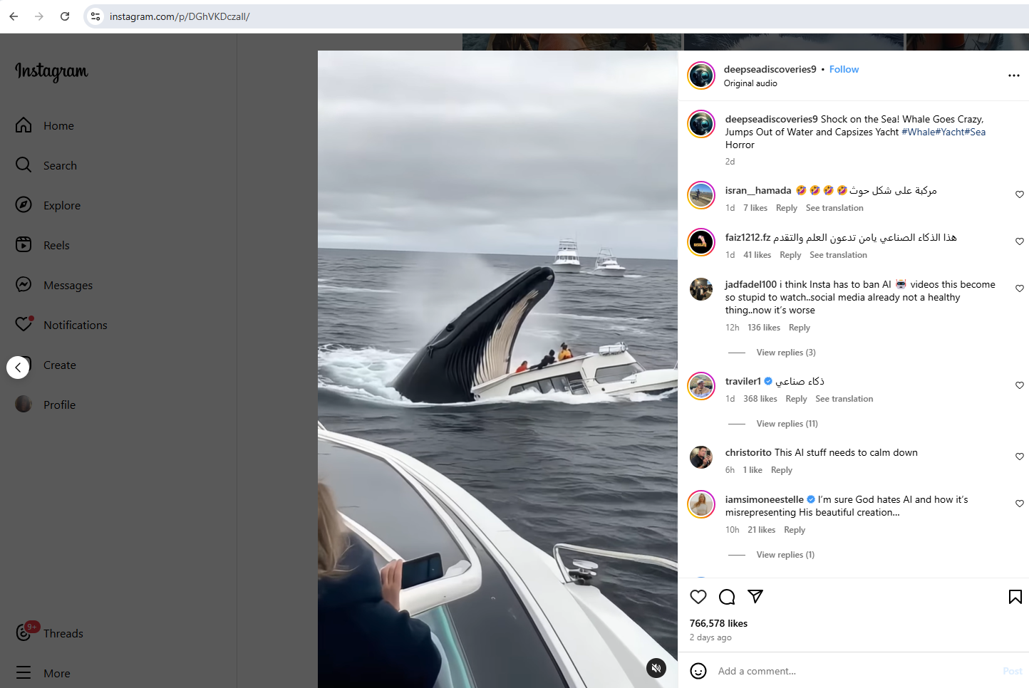 فالبحث عن المقطع، بتجزئته الى مشاهد ثابتة (Invid)، يوصلنا الى حساب deepseadiscoveries9@ في انستغرام، والذي نشره في 26 شباط 2025، مع تعليق: Shock on the Sea! Whale Goes Crazy, Jumps Out of Water and Capsizes Yacht، اي صدمة في البحر! حوت يجن ويقفز من الماء ويقلب يختاً.