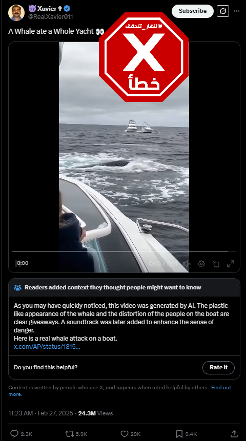 تقييمنا النهائي: اذاً، ليس صحيحاً ان الفيديو المتناقل يظهر "حوتا يبتلع قاربا في عرض البحر". في الواقع، هذه المشاهد ليست حقيقية، لتضمنها مؤشرات الى انها منشأة بواسطة برنامج ذكاء اصطناعي.