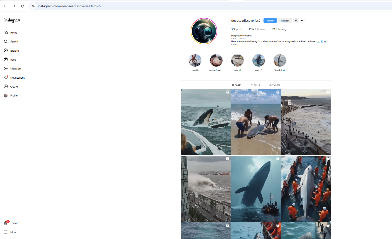 وتكفي جولة في حساب deepseadiscoveries9@ لتبيان ان الفيديوات التي ينشرها منشأة، على غرار فيديو الحوت، بالذكاء الاصطناعي، اي انها غير حقيقية. وتظهر كائنات، لا سيما بحرية، ضخمة او غريبة.