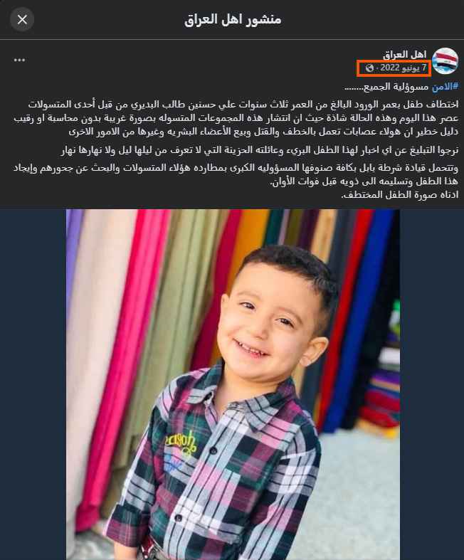 1- تعود الحادثة إلى عام 2022، يوم انتشر الإبلاغ على مواقع التواصل الاجتماعي، بعد فقدان الطفل علي حسنين طالب البديري في مدينة القاسم بمحافظة بابل وسط العراق مساء 7 يونيو/حزيران.