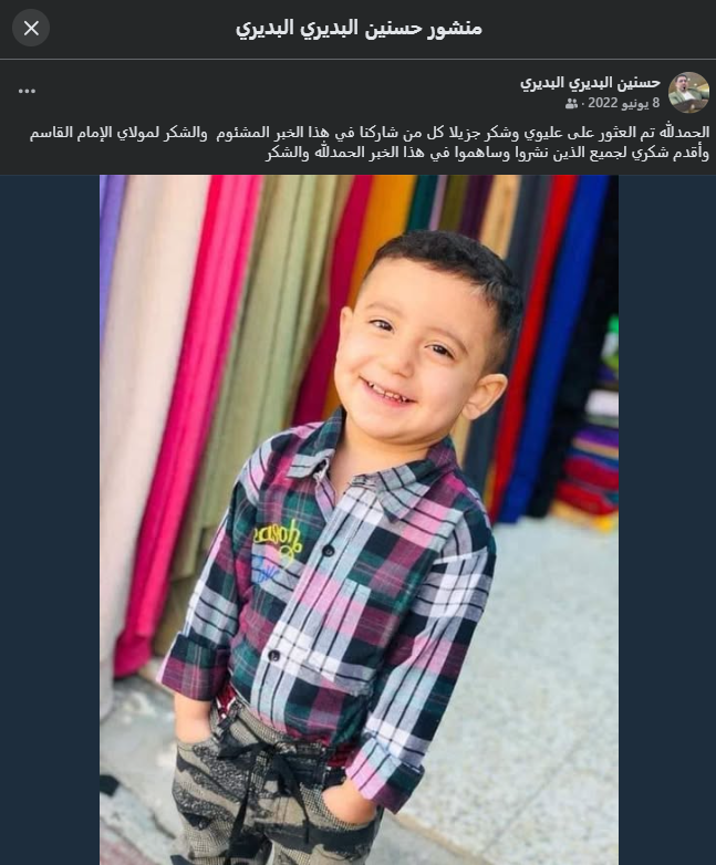 ونشر والد الطفل علي حسنين في حسابه على منصة فايسبوك، يوم 8 يونيو/حزيران 2022، منشوراً أعلن فيه العثور على ابنه، ووجّه شكره لكل من شارك في نشر خبر اختطاف ابنه.