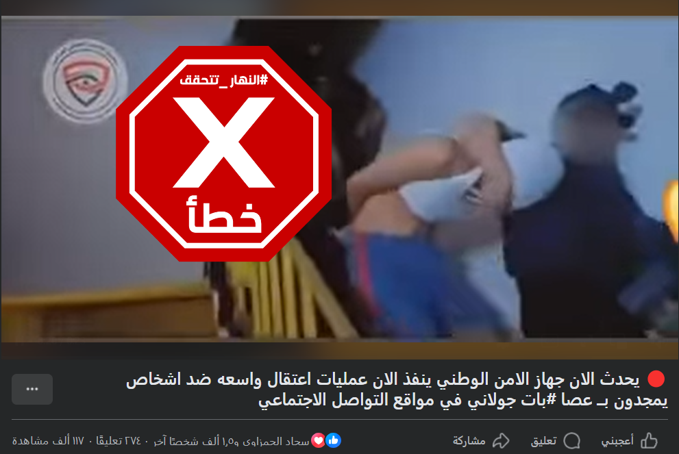 في الادّعاء المتداول، فيديو يظهر عناصر تابعين لجهاز الأمن الوطني العراقي، وهم ينفذون عمليات اعتقال لاشخاص خلال وجودهم في أماكن سكنهم. وأرفق بتعليق (من دون تدخّل): "يحدث الآن- جهاز الامن الوطني ينفذ الآن عمليات اعتقال واسعه ضد اشخاص يمجدون عصابات الجولاني في مواقع التواصل الاجتماعي".