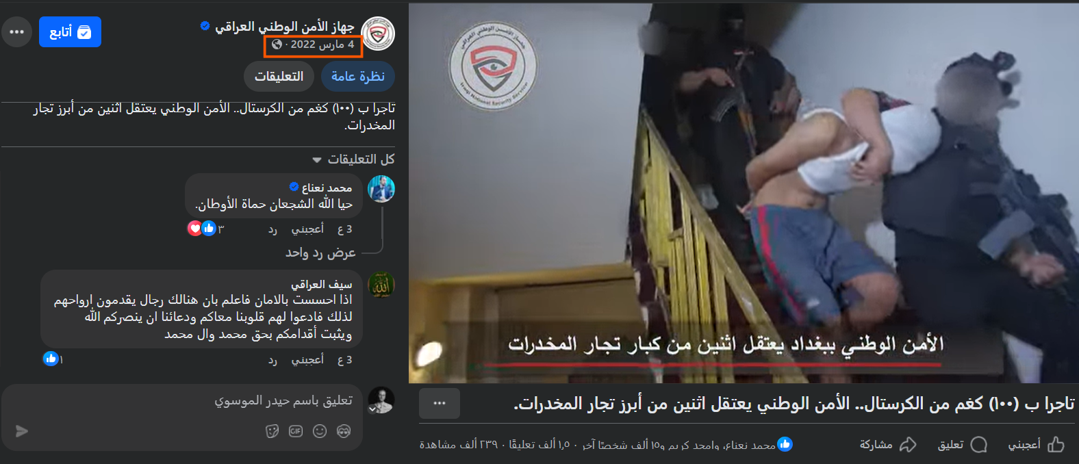 الفيديو المتداول قديم، اذ نشرته صفحة جهاز الأمن الوطني العراقي على فايسبوك، في 4 مارس/آذار 2022. وهو لعملية اعتقال اثنين من أبزر تجار المخدرات في العاصمة بغداد، كانا قد تاجرا بـ100 كلوغرام من الكريستال.