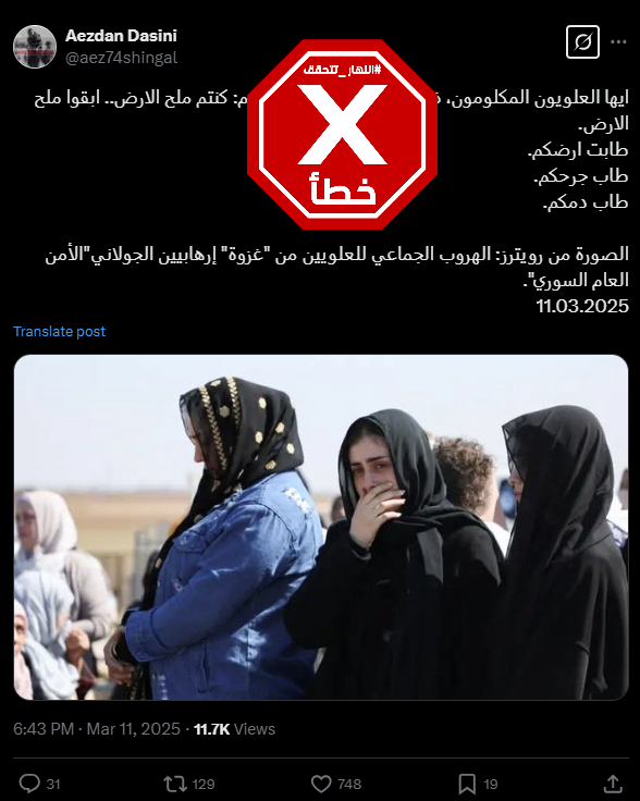 تظهر الصورة نساء تجمّعن في مكان. وقد تكثف التشارك فيها خلال الساعات الماضية عبر حسابات ارفقتها بالمزاعم الآتية (من دون تدخل): " الصورة من رويترز: الهروب الجماعي للعلويين من غزوة الأمن الوطني السوري".
