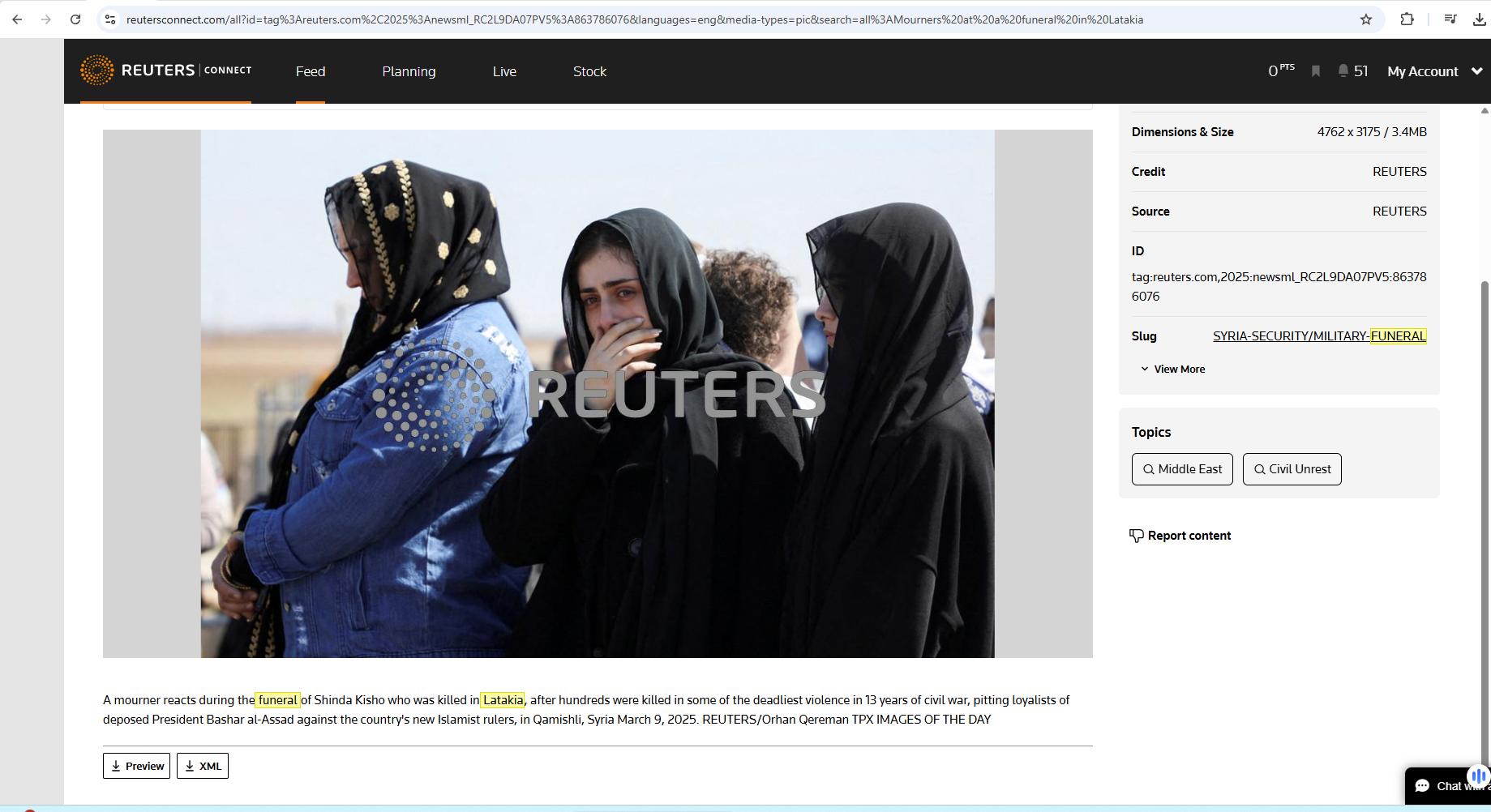 فالبحث العكسي يوصلنا الى خيوط تقودنا الى الصورة مؤرشفة في موقع وكالة "رويترز"، مع شرح انها تظهر "مشيعيات خلال جنازة شيندا كشو Shinda Kisho في القامشلي بسوريا، في 9 آذار 2025، اثر مقتلها في اللاذقية، بعد مقتل مئات في بعض أكثر أعمال العنف دموية خلال 13 عاما من الحرب الأهلية، بين موالين للرئيس المخلوع بشار الأسد  والحكام الإسلاميين الجدد للبلاد".