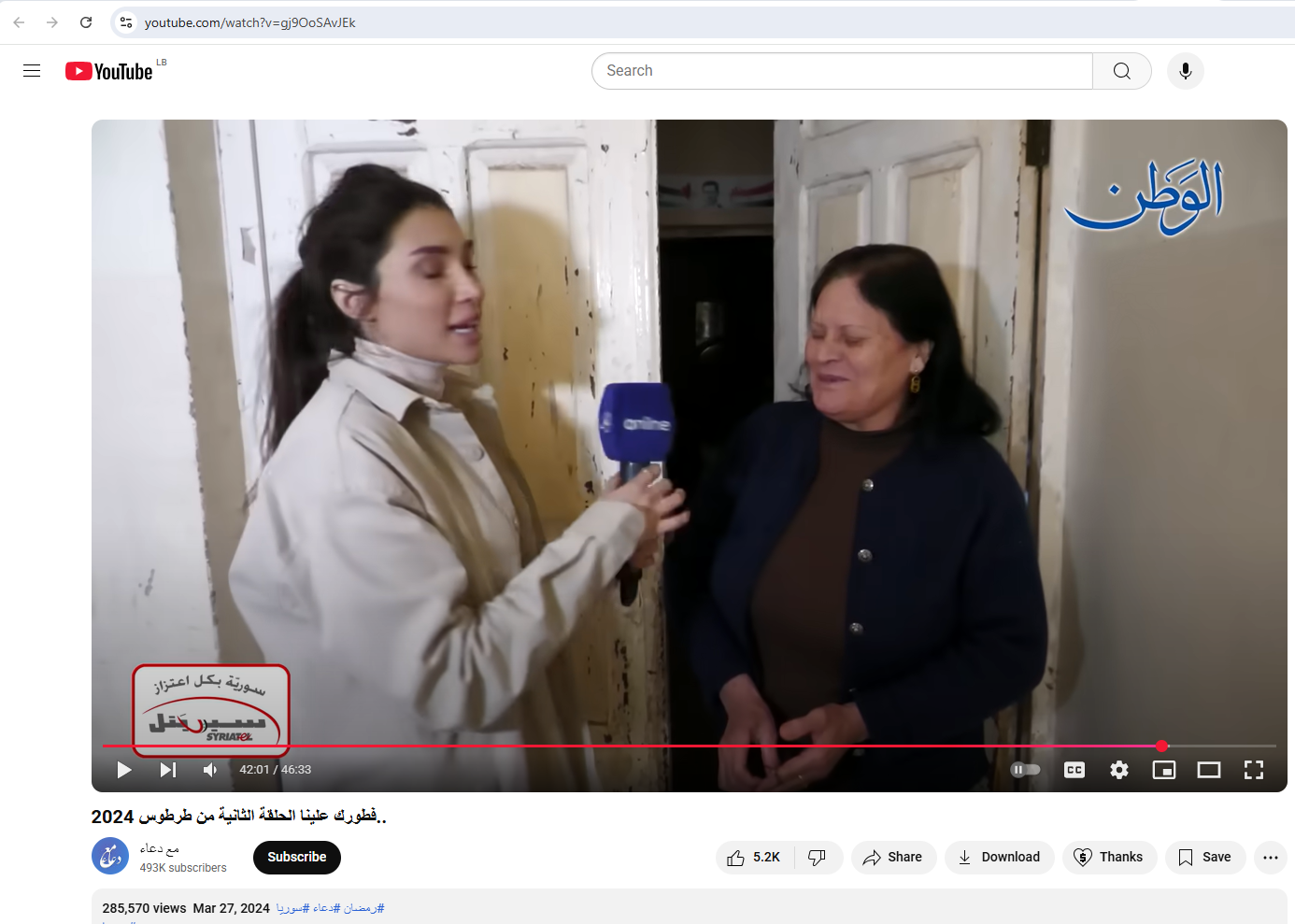 فالبحث في حساب برنامج "مع دعاء" في يوتيوب، يبيّن ان الصورة المتناقلة مقتطعة من فيديو طويل (46.33 دقيقة) منشور في 27 آذار 2024، بعنوان: فطورك علينا- الحلقة الثانية من طرطوس 2024".