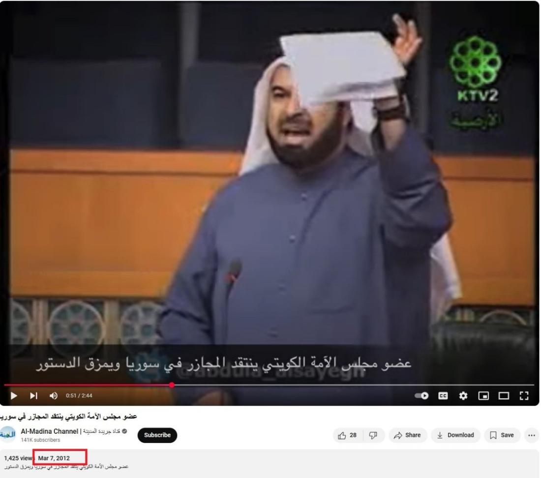 في ضوء ذلك، أرشد البحث باستخدام كلمات مفتاح، مثل "نائب كويتي يمزق دستور سوريا"، إلى المقطع نفسه منشوراً في مواقع إخباريّة عدّة عام 2012.