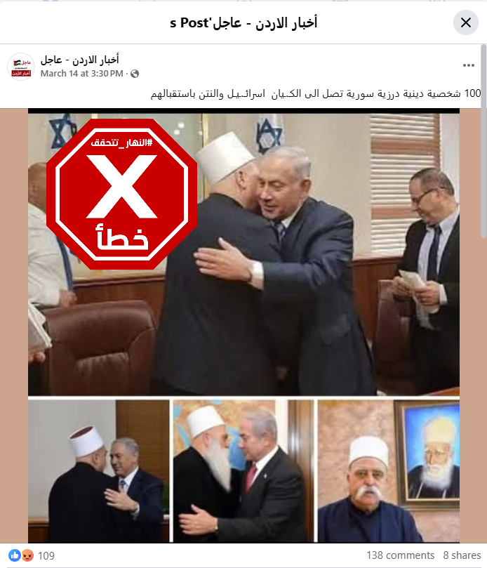 تظهر الصور رئيس الوزراء الاسرائيلي بنيامين نتنياهو معانقا رجال دين او مرحبا بهم. وقد تكثف التشارك فيها أخيرا عبر حسابات ارفقتها بالمزاعم الآتية (من دون تدخل): "100 شخصية دينية درزية سورية تصل الى كيان اسرائيل ونتنياهو باستقبالها".