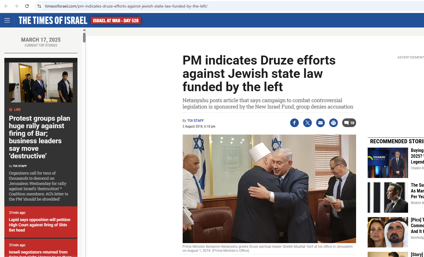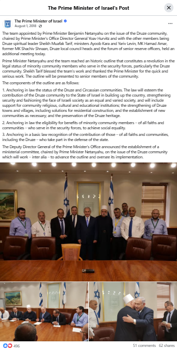يقودنا البحث العكسي عنها الى صفحة رئيس وزراء اسرائيل في الفايسبوك، والتي نشرتهافي 1 آب 2018. وكتبت معها: "عقد الفريق الذي عيّنه رئيس الوزراء بنيامين نتنياهو بشأن قضية الطائفة الدرزية، برئاسة المدير العام لمكتب رئيس الوزراء يوآف هورفيتس، وعضوية الزعيم الروحي الدرزي الشيخ موفق طريف، والوزراء أيوب قرا وياريف ليفين، وعضو الكنيست حمد عمار، وعضو الكنيست السابق ششيف شنان، ورؤساء المجالس المحلية الدرزية، ومنتدى كبار ضباط الاحتياط، اجتماعا إضافيا اليوم. وتوصل رئيس الوزراء نتنياهو والفريق إلى مخطط تاريخي يُشكّل ثورة في الوضع القانوني لأفراد الأقلية الدرزية، الذين يخدمون في قوات الأمن، بخاصة الطائفة الدرزية. وبارك الشيخ طريف عمل الفريق، وشكر رئيس الوزراء على العمل السريع والجاد. وسيتم عرض المخطط على كبار أعضاء الطائفة".