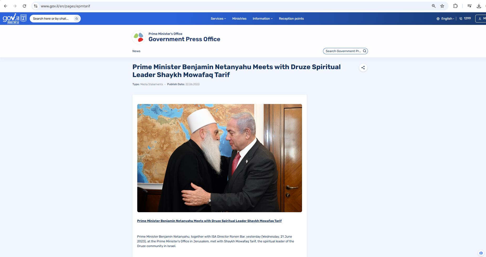 نشرها مكتب رئيس الوزراء الاسرائيلي في موقعه الرسمي، مع شرح انها تعود "لاستقبال رئيس الوزراء بنيامين نتنياهو الزعيم الروحي للطائفة الدرزية في إسرائيل الشيخ موفق طريف، في مكتب رئيس الوزراء في القدس، الأربعاء 21 حزيران 2023، في حضور مدير جهاز الأمن العام الإسرائيلي رونين بار".