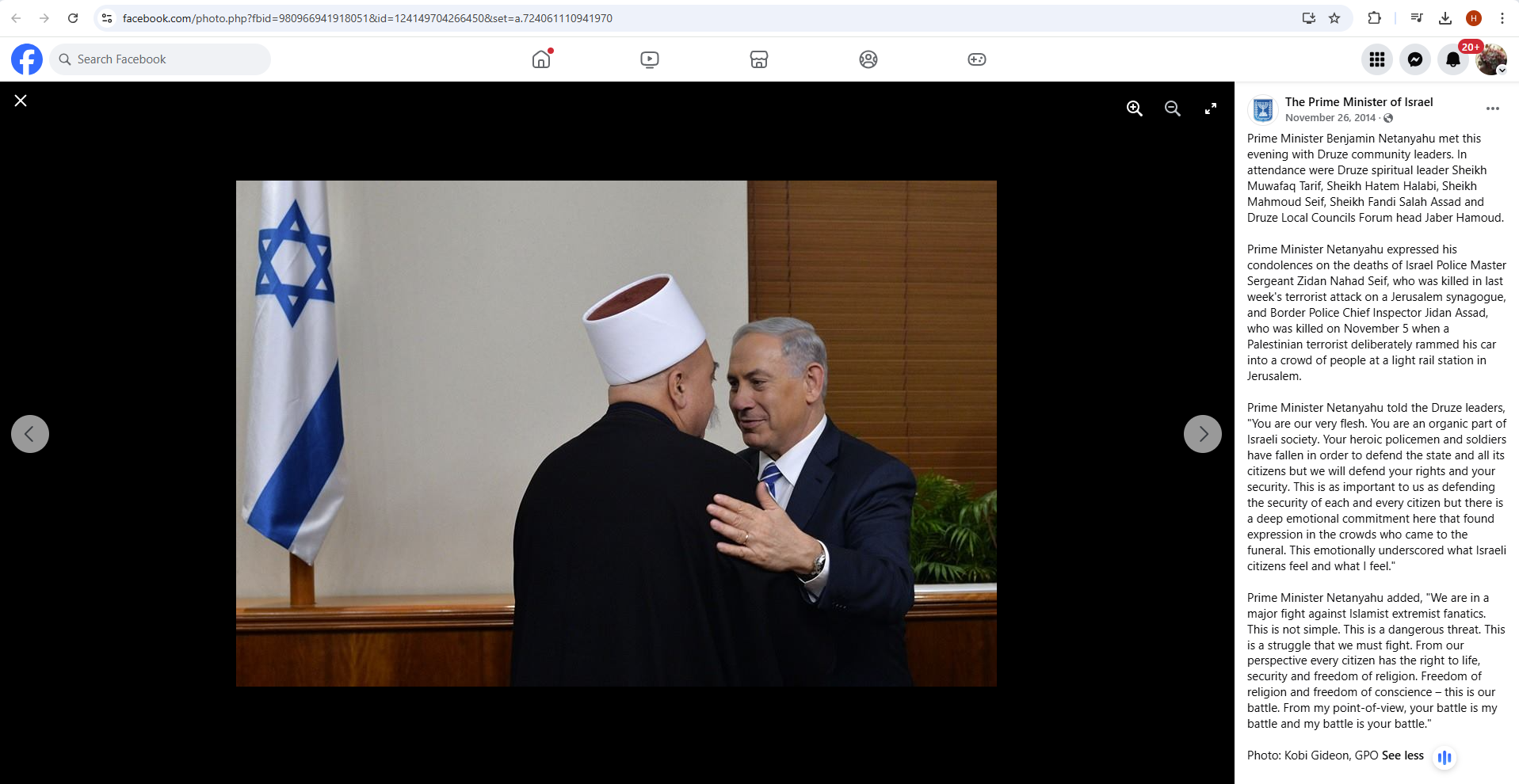 قديمة على غرار الصورتين السابقتين، اذ نشرتها صفحة رئيس وزراء اسرائيل في الفايسبوك، في 26 تشرين الثاني 2014، مع شرح ان "نتنياهو التقى مساء اليوم قادة الطائفة الدرزية. وحضر اللقاء الزعيم الروحي الدرزي الشيخ موفق طريف، والشيخ حاتم حلبي، والشيخ محمود سيف، والشيخ فندي صلاح أسعد، ورئيس منتدى المجالس المحلية الدرزية جابر حمود. وقدّم نتنياهو تعازيه بوفاة الرقيب في الشرطة زيدان نهاد سيف، الذي قُتل في هجوم وقع الأسبوع الماضي على كنيس يهودي في القدس، وكبير مفتشي حرس الحدود جدعان أسعد، الذي قُتل في 5 تشرين الثاني عندما دهس فلسطيني بسيارته حشدا من الناس في محطة قطار خفيف في القدس".