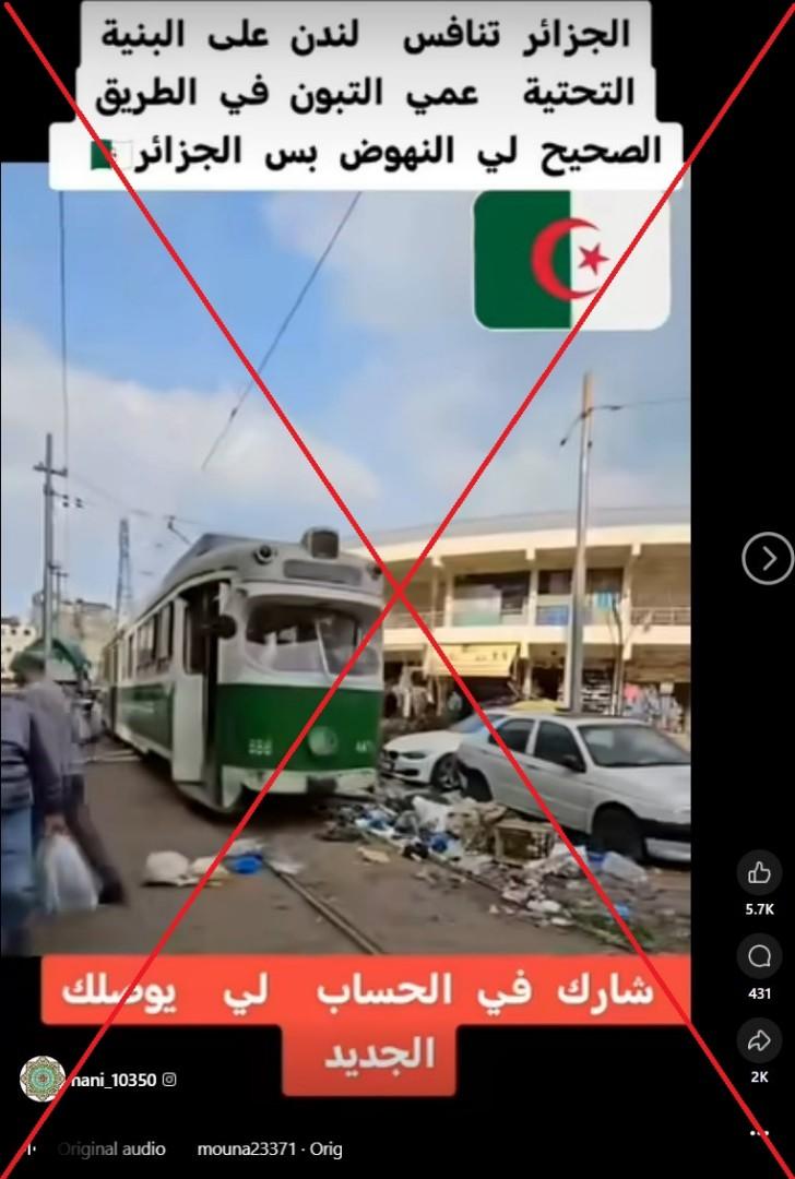 تُعلن السلطات الجزائريّة باستمرار أنها تولي اهتماماً خاصاً بتأهيل البنى التحتيّة ولا سيّما القطارات وخطوط السكك الحديد. في هذا السياق، نشرت صفحات وحسابات على مواقع التواصل الاجتماعي فيديو لقطار قديم في منطقة شعبية مكتظة ويُسمع فيه صوت مذيعة تتحدّث عن الإنجازات الجزائريّة في البنى التحتيّة، وأرفق الفيديو بتعليقات ساخرة مثل "الجزائر على الطريق الصحيح". لكن هذا الفيديو في الحقيقة لا شأن له بالجزائر بل هو مصوّر في مصر ويُظهر الترامواي الشهير في مدينة الإسكندرية الذي يعود للقرن التاسع عشر، أما الصوت المسموع في الفيديو فهو مركّب عليه.