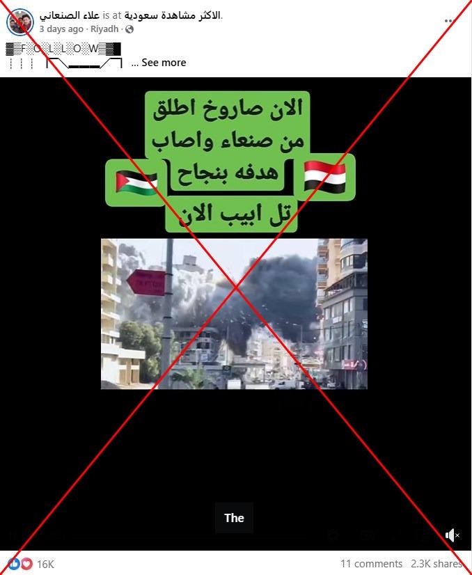 يواصل الحوثيون هجماتهم الصاروخيّة باتجاه إسرائيل وقد أعلن الجيش الإسرائيلي الخميس اعتراض صاروخين أطلقا من اليمن. وفي هذا السياق تداول مستخدمون لمواقع التواصل الاجتماعي فيديو زعم ناشروه أنّه لسقوط صاروخٍ يمنيّ في تل أبيب مدمّراً أحد المباني. إلا أنّ الفيديو في الحقيقة يعود لقصفٍ إسرائيليّ على ضاحية بيروت الجنوبيّة في تشرين الثاني/نوفمبر 2024 خلال الحرب الأخيرة.