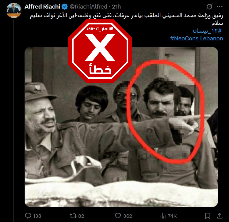 المتداول: صورة تظهر، وفقاً للمزاعم، "رئيس الحكومة اللبنانية نواف سلام واقفاً بالزي العسكري الى جانب رئيس منظمة التحرير الفلسطينية ياسر عرفات، خلال الحرب في لبنان عام 1982".