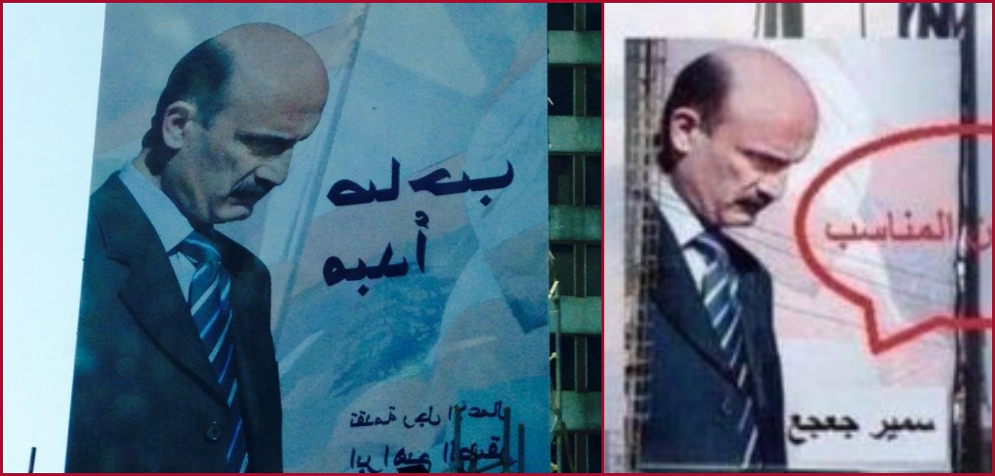 وقد تواصلنا مع فارس، الذي أفادنا بأن لافتة جعجع "كانت مرفوعة يومذاك في ذوق مكايل، منطقة جونية، بجوار مدخل الكسليك على الطريق السريع"، وفقاً لما يتذكر.
