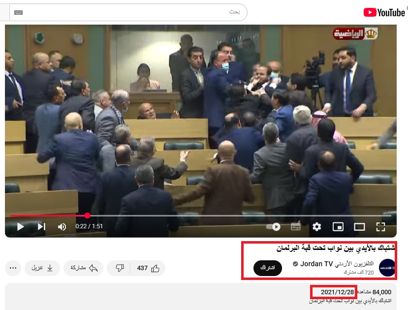 ولكن بعد تفكيك الفيديو إلى صور، عبر أداة InVid، قاد البحث العكسي إلى أن توصيف المقطع غير صحيح تماما، إذ يعود إلى اشتباكات بالأيدي بين أعضاء في مجلس النواب الأردني تحت قبة البرلمان 28 كانون الأول (يناير) 2021.