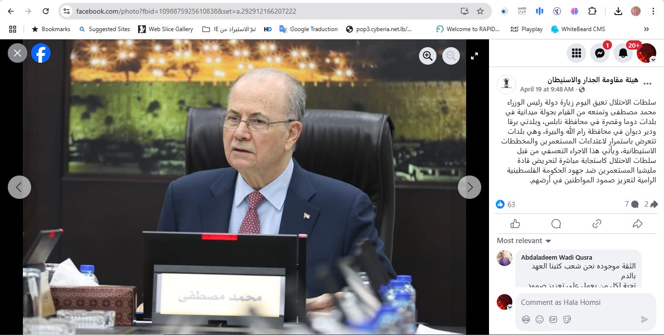 جاء تداول الصورة في وقت منعت السلطات الإسرائيلية، السبت 19 نيسان 2025، رئيس الوزراء الفلسطيني محمد مصطفى من زيارة عدد من البلدات والقرى في محافظتي رام الله ونابلس بالضفة الغربية، وفقا لما ذكرت تقارير اعلامية.