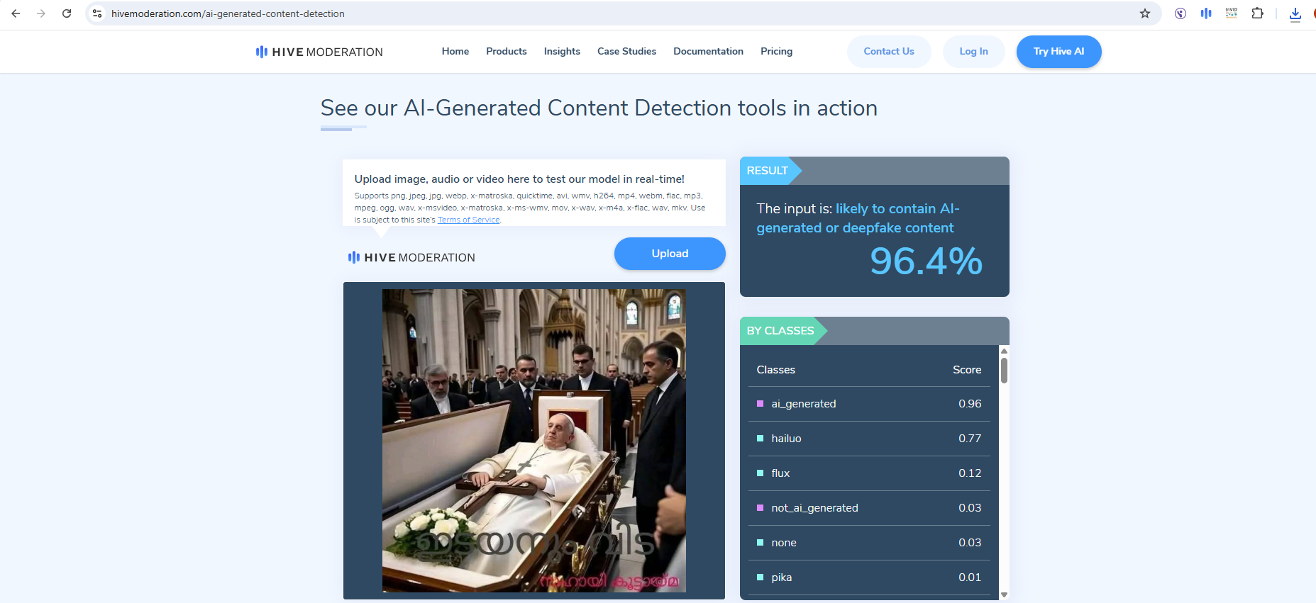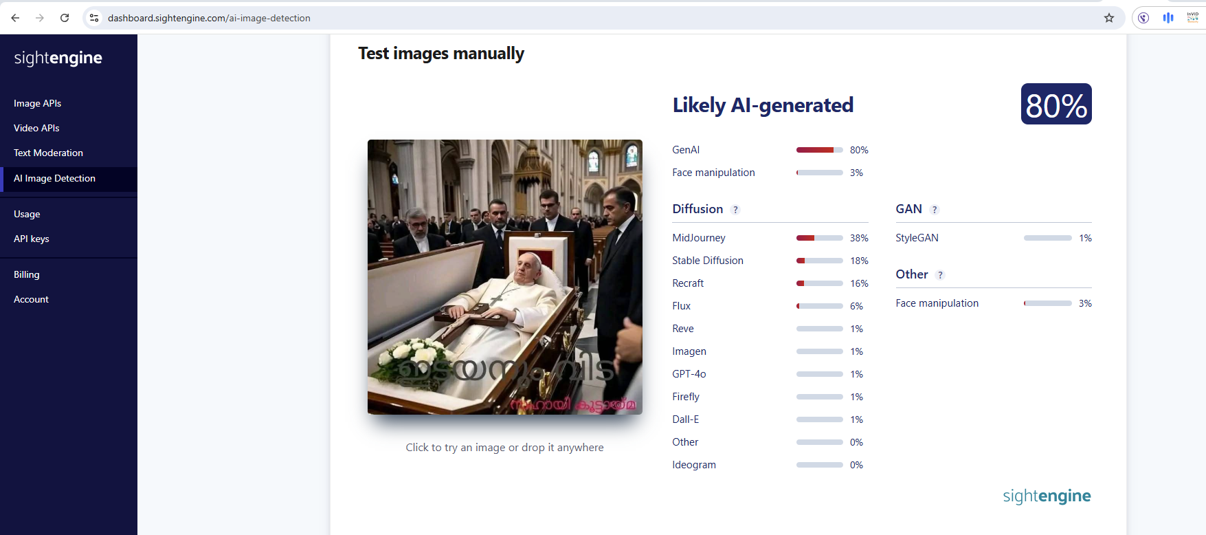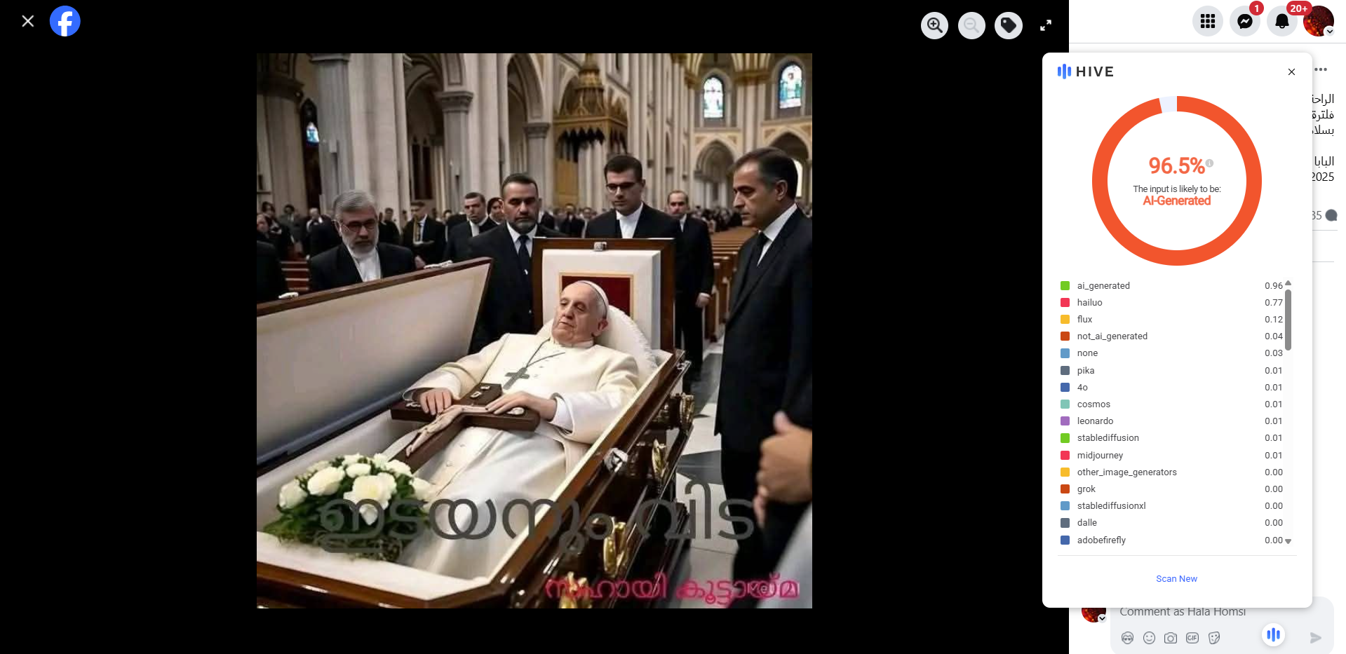 ويدعم ذلك فحص الصورة عبر مواقع متخصصة بكشف الصور الزائفة، مثل Hive Google وHive moderation وSightengine... والذي كانت نتيجته ان الصورة مولدة على الارجح بواسطة الذكاء الاصطناعي بنسبة تصل الى 96.5%.