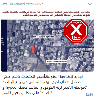 منذ ساعات، يتناقل مستخدمون، لا سيما عبر الواتساب، خريطة مرفقة بالتحذير الآتي (من دون تدخل): "تهديد للضاحية الجنوبية: أصدر المتحدث باسم جيش الاحتلال افيخاي ادرعي تهديدا للمباني في برج البراجنة تحويطة الغدير نزلة الكوكودي، بجانب محطة hypco، و ذلك رداً على خطاب نعيم قاسم".