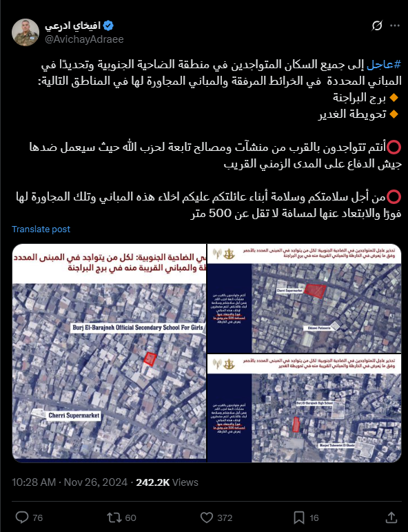 أنتم موجودون بالقرب من منشآت ومصالح تابعة لحزب الله سيعمل ضدها جيش الدفاع على المدى الزمني القريب. من أجل سلامتكم وسلامة أبناء عائلتكم، عليكم اخلاء هذه المباني وتلك المجاورة لها فورًا والابتعاد عنها لمسافة لا تقل عن 500 متر".