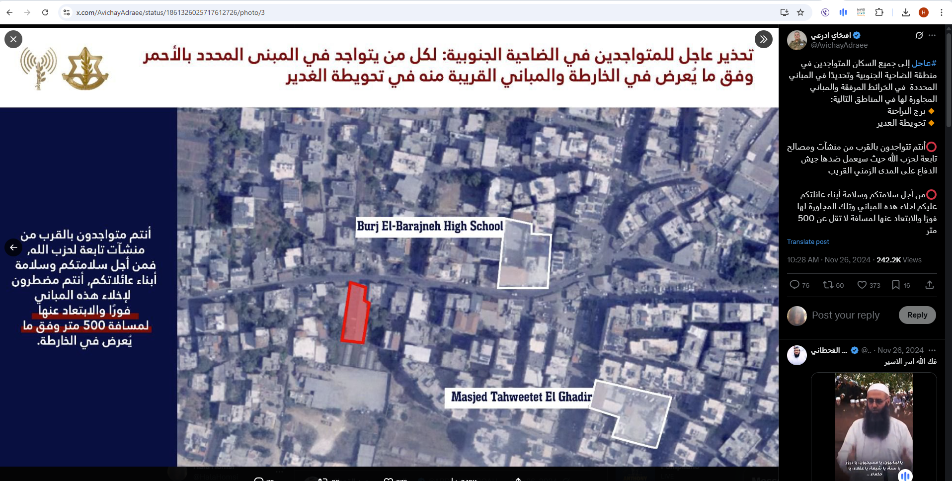 قديمة، اذ يقودنا البحث العكسي عنها الى خيوط توصلنا اليها منشورة في حساب أدرعي في 26 تشرين الثاني 2024، ضمن التحذير الآتي: "إلى جميع السكان الموجودين في منطقة الضاحية الجنوبية، وتحديدًا في المباني المحددة  في الخرائط المرفقة والمباني المجاورة لها في المناطق التالية:
