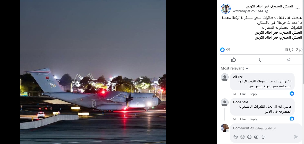 فقد نشرت حسابات على فايسبوك صورة لطائرة شحن عسكرية عليها علم تركيا. وكتبت معها (من دون تدخل): "هبطت قبل قليل  في باكستان 6 طائرات شحن عسكرية تركية محملة بمعدات حربية".