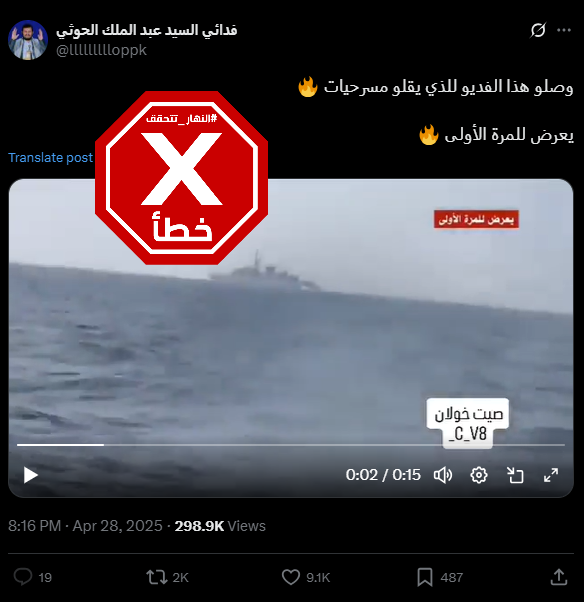 وقد جاء تداول هذا المقطع بالمزاعم الخاطئة، في وقت أعلنت جماعة الحوثي في اليمن، الإثنين 28 نيسان 2025، استهداف حاملة الطائرات الأميركية هاري ترومان والقطع الحربية التابعة لها، وقصف هدف حيوي في منطقة عسقلان في إسرائيل.