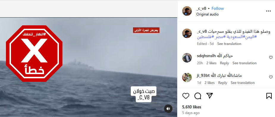 تظهر المشاهد سفينة في عرض البحر قبل أن يهزها انفجار قوي ويتصاعد منها دخان ونار. وقد تكثف التشارك في المقطع أخيراً عبر حسابات كتبت معه (من دون تدخل): "وصلو هذا الفديو للذي يقلو مسرحيات. يُعرض للمرة الأولى"، وذلك في إشارة الى تعرّض سفن حربية اميركية في البحر لهجمات من الحوثيين.