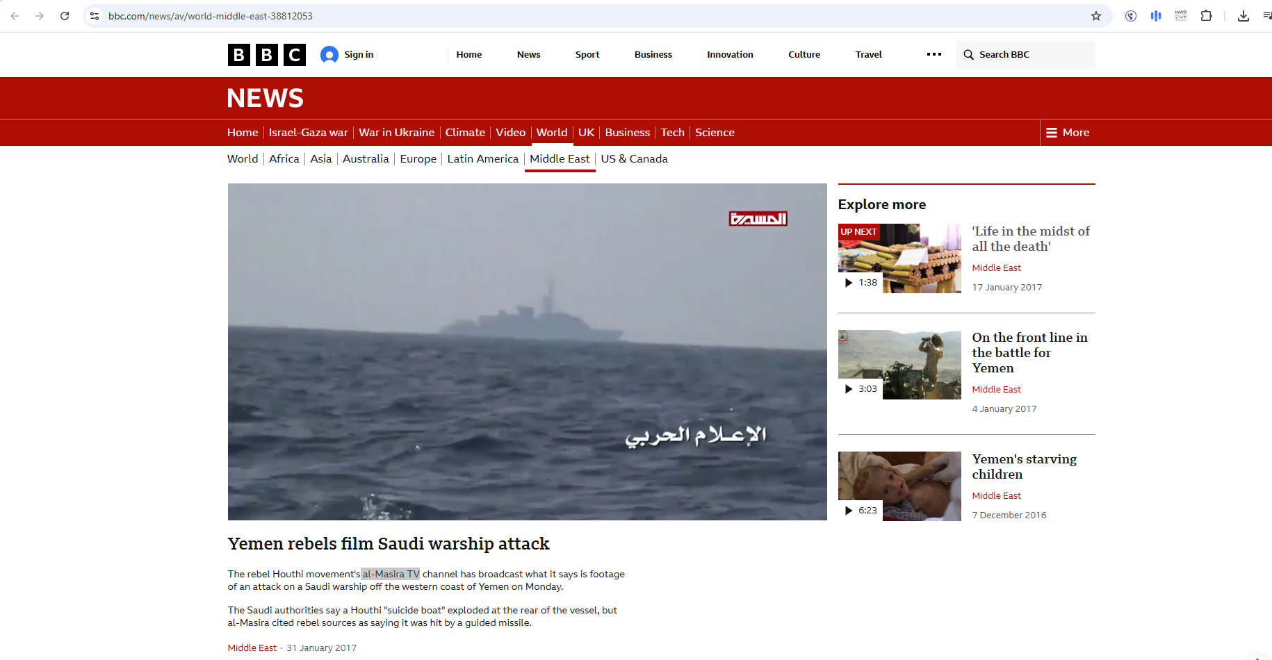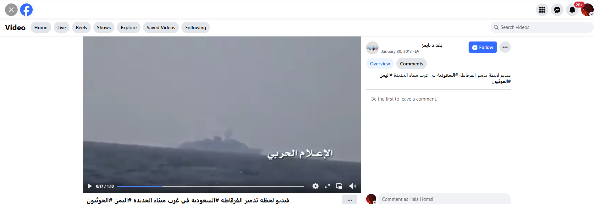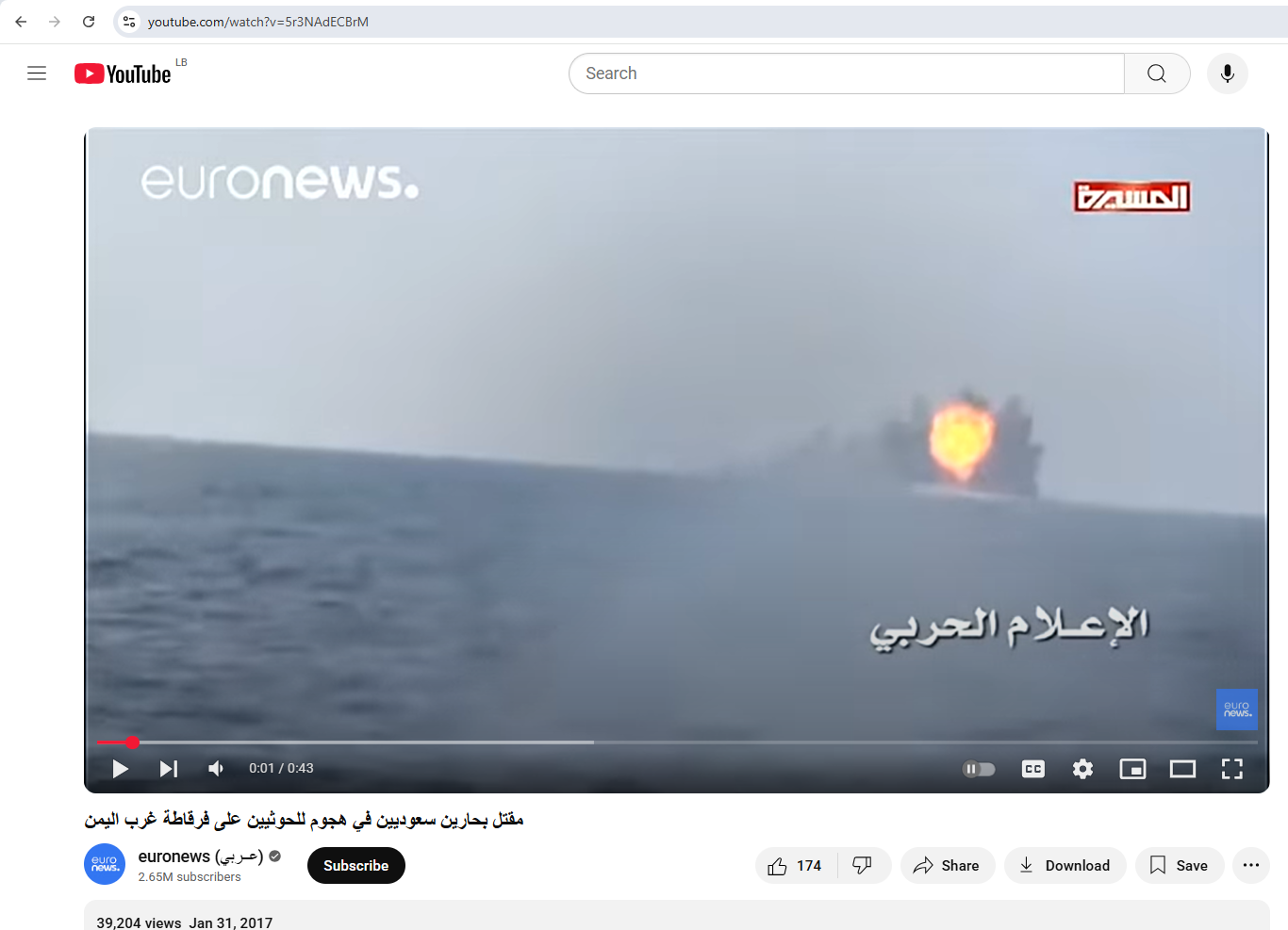 فالبحث عن المقطع، بتجزئته الى صور ثابتة (Invid)، يوصلنا الى وكالات أنباء عالمية، وحسابات عدة، ومواقع اخبارية نشرته او نشرت لقطات ثابتة منه، في 30- 31 كانون الثاني 2017، بكونه يظهر هجوماً في البحر الاحمر شنّه الحوثيون ضد فرقاطة سعودية اثناء دورية لها قبالة اليمن